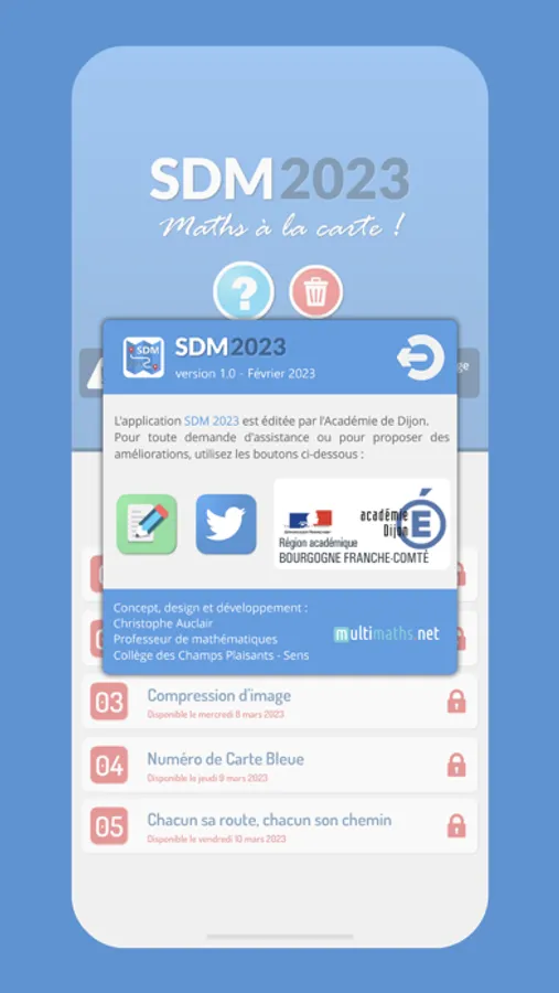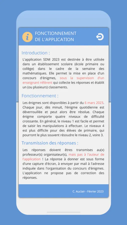 L'application SDM 2023 est destinée à être utilisée dans un établissement scolaire (école primaire ou collège) dans le cadre de la semaine des mathématiques. Elle permet la mise en place d'un concours d'énigmes, sous la supervision d'un enseignant référent qui collecte les réponses et établit un (ou plusieurs) classements.