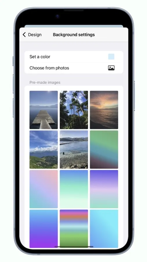 - Setup your own design: choose your image or photo for the background and set colors you want or use pre-made color themes.