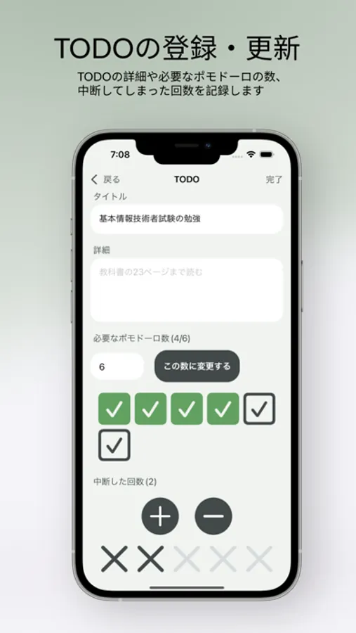 TODOごとに必要なポモドーロ数や中断した回数を記録しながら、そのタスクを進めることができます。