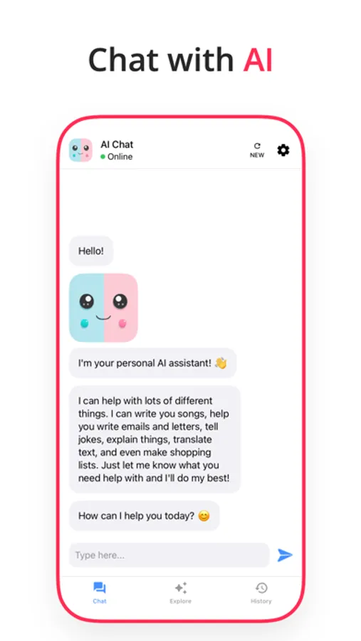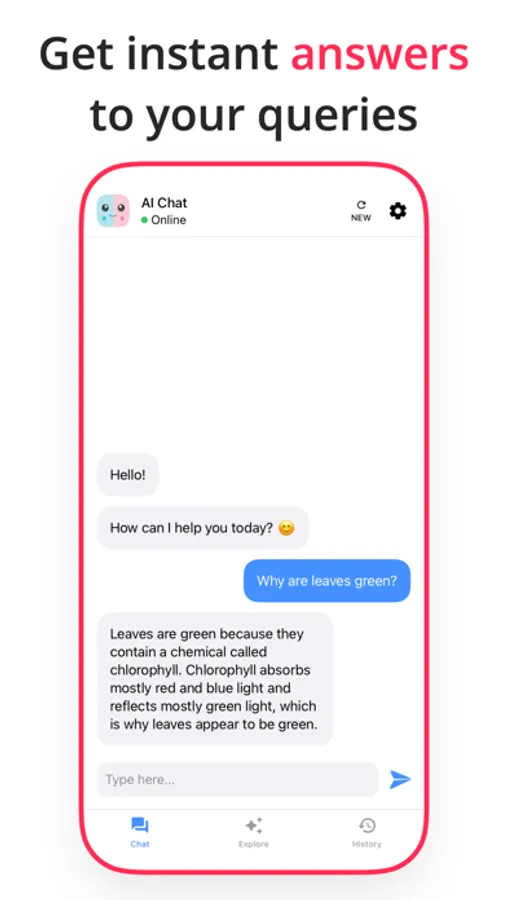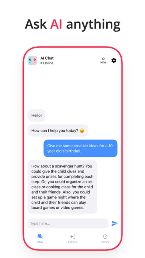 Whether you're seeking information, want to pass the time, or just need someone to talk to, our AI Chatbot is here for you 24/7. The app is designed to understand and respond to your queries in the most human-like manner possible. Whether you're asking about birthday party ideas, some complex question, or just need a joke, our AI will provide you with relevant, accurate and up-to-date information.