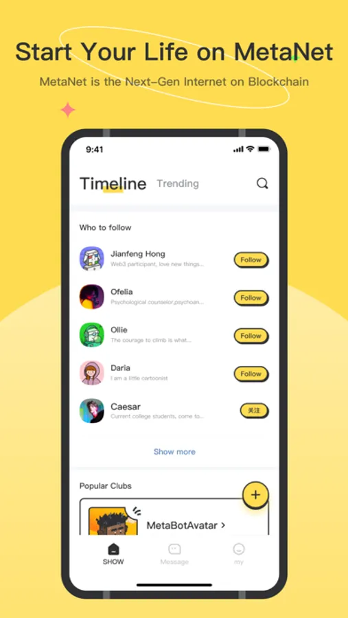 Our goal is to use the latest blockchain technology, with NFT as the core and social activities as the entry, to build Show3 into people's favorite Web3 platform.