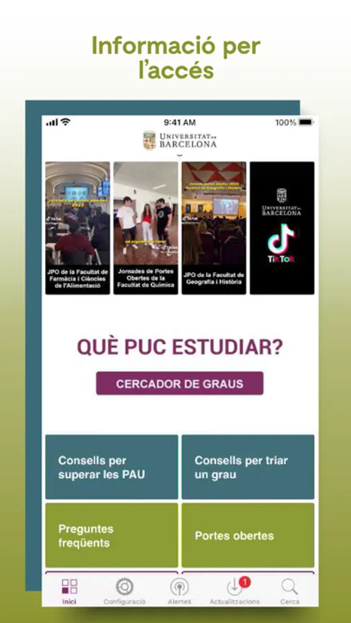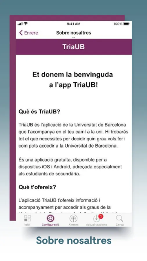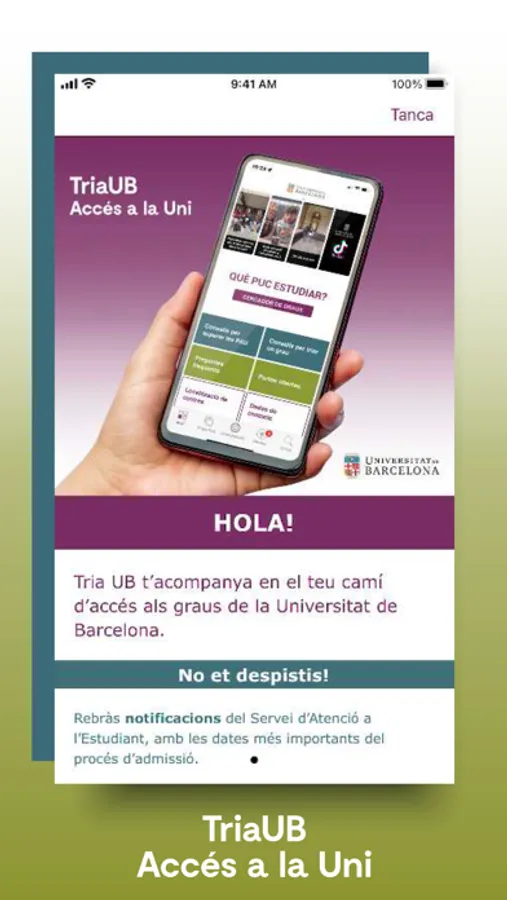 L’aplicació Tria UB t’ajuda en tot el que necessites per decidir quin grau vols fer i com pots accedir a la Universitat de Barcelona.
