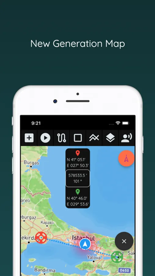 Measuring distance and bearing with two position is super easy. Just drag markers and see instant result on map screen.