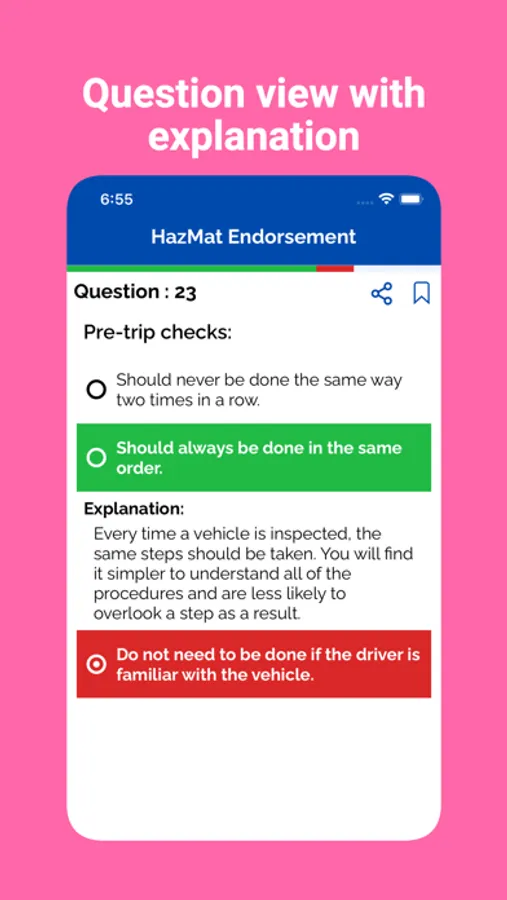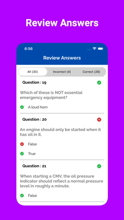 Our app includes a variety of practice questions for the Driver's license exam for Commercial Vehicles. These questions are based on the official handbook of different states.