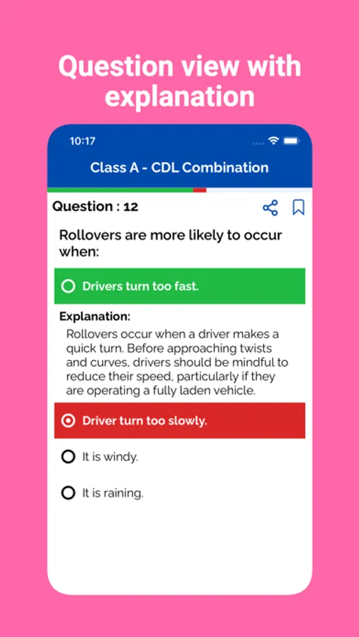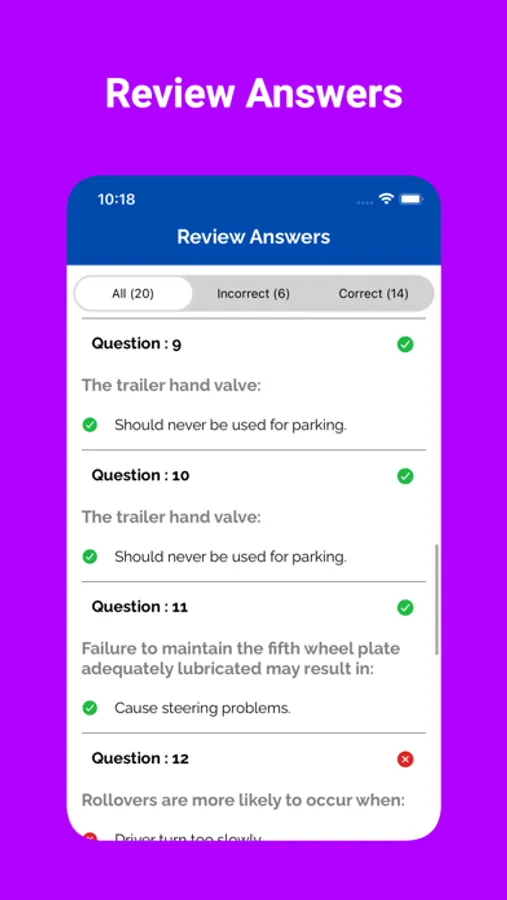 Our app includes a variety of practice questions for the Driver's license exam for Commercial Vehicles. These questions are based on the official handbook of different states.
