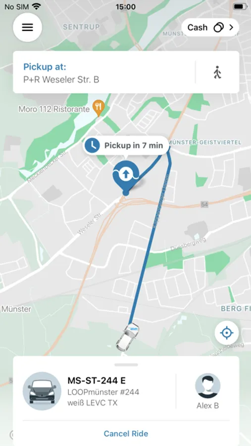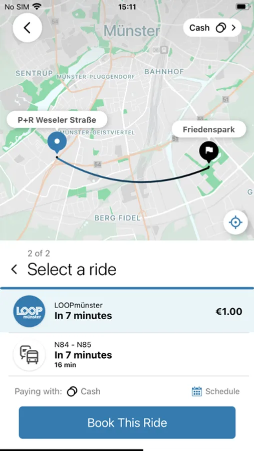 The vehicle is shared with other passengers. The software automatically bundles similar travel requests and selects the optimal route. You need a valid bus ticket, in LOOPmünster there is an additional charge of 1 euro per booking