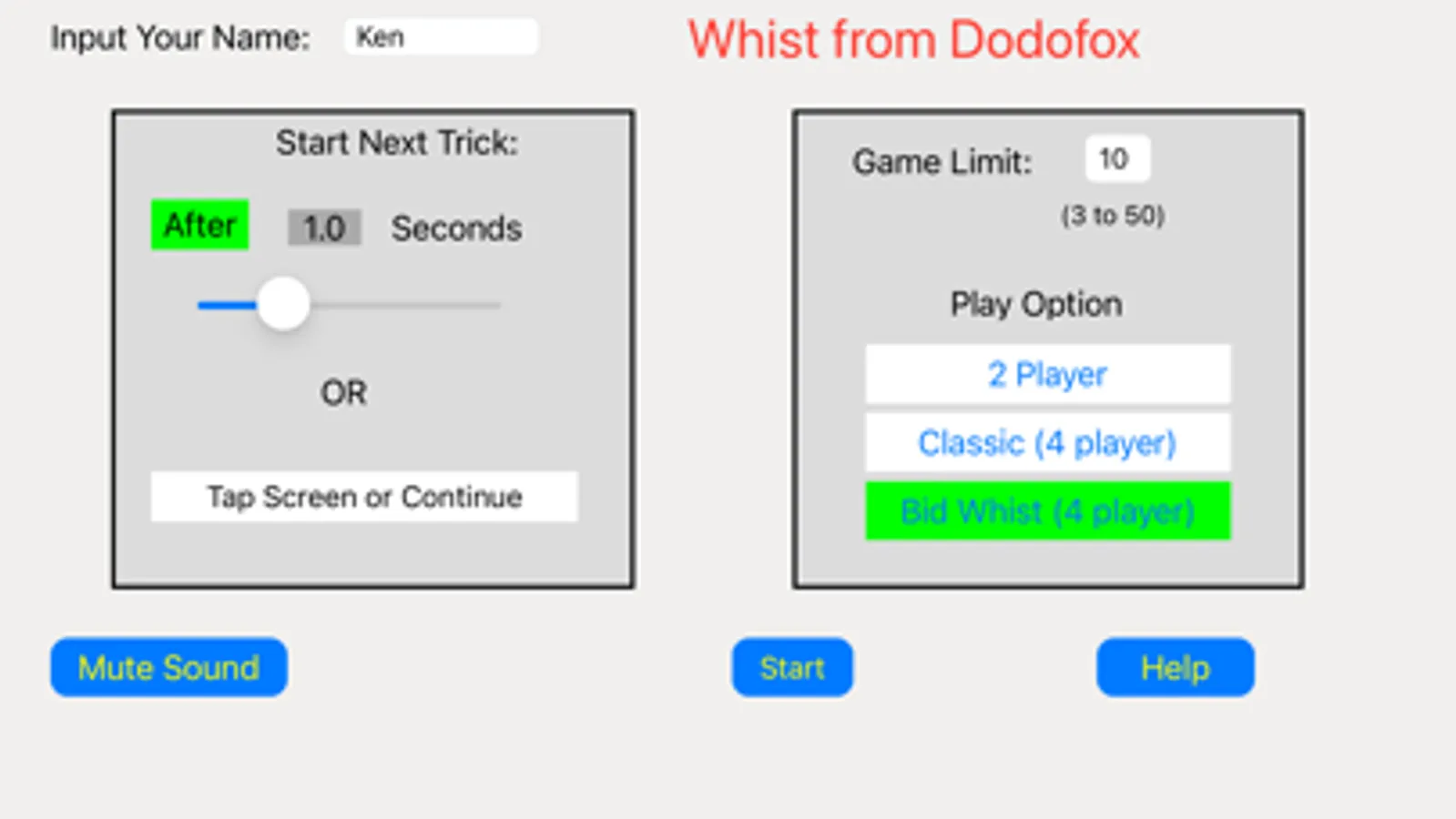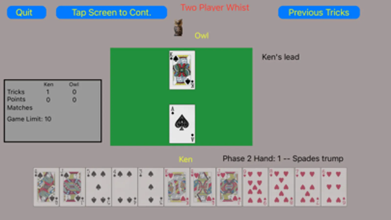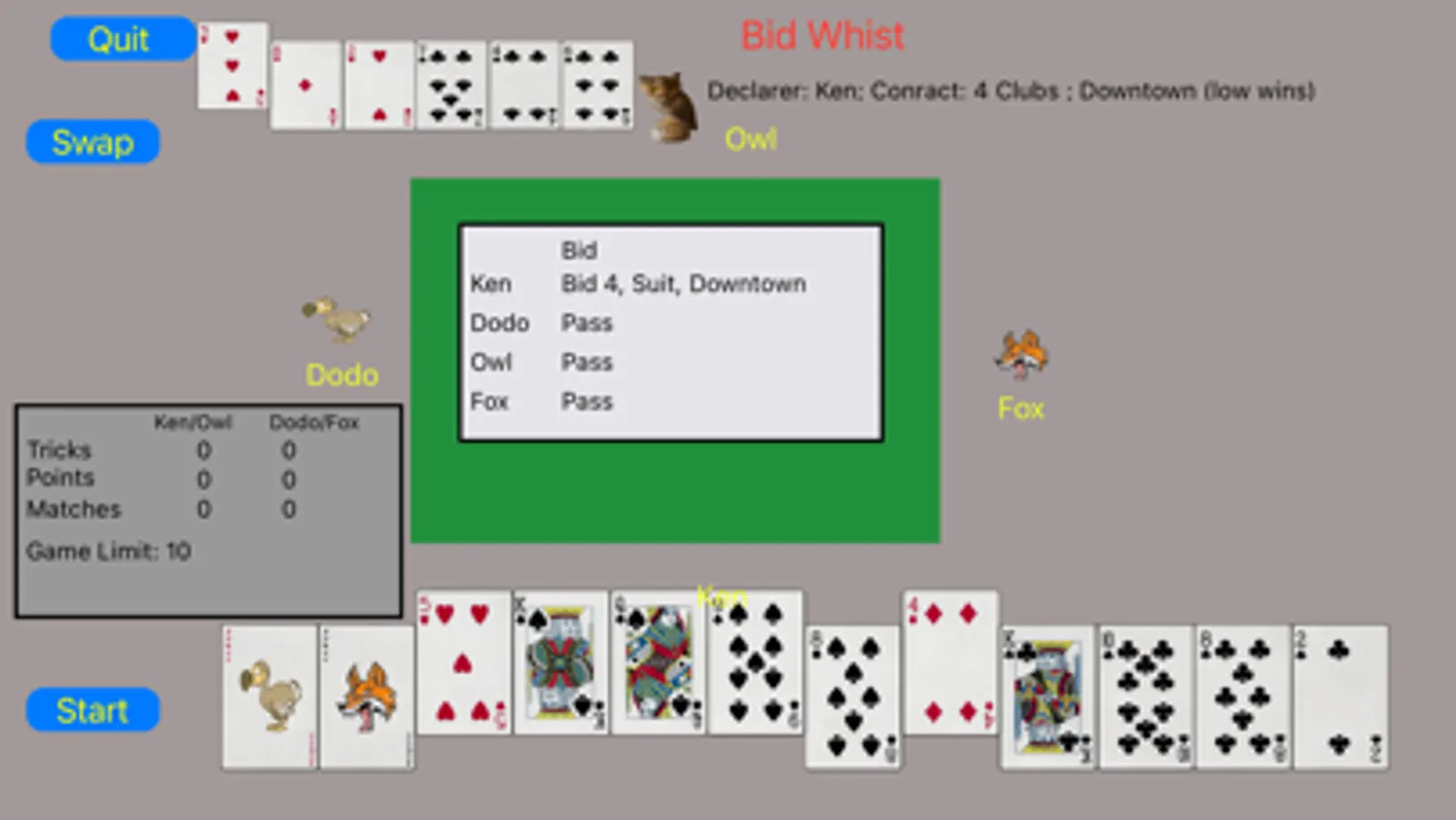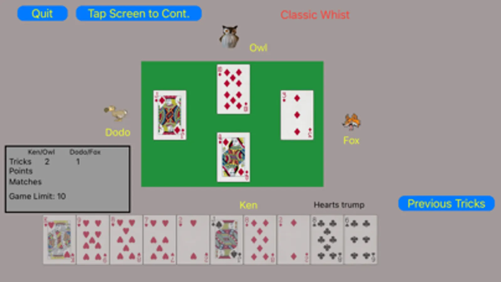 Play Classic 4 player Whist, 2 player Whist, or 4 player Bid Whist. Great way to introduce new Bridge players to the fundamentals and mechanics of Bridge.