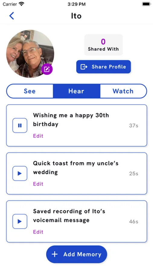 With Memento you can build shareable memory banks and never again worry about losing precious, digital content. Create profiles for your loved ones and upload images, audio files, and videos. Keep content private or share profiles with friends and family to collaborate in a group setting.