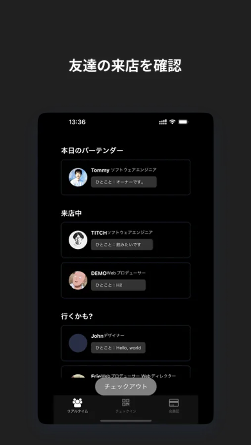 このアプリでは、行くかもリクエストやバーメニューの閲覧、会員内でのプロフィールの共有を行うことができます。