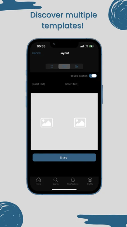 Click on the add(plus) icon on the application home page, select the template, and add media by clicking the media box and caption using the text field