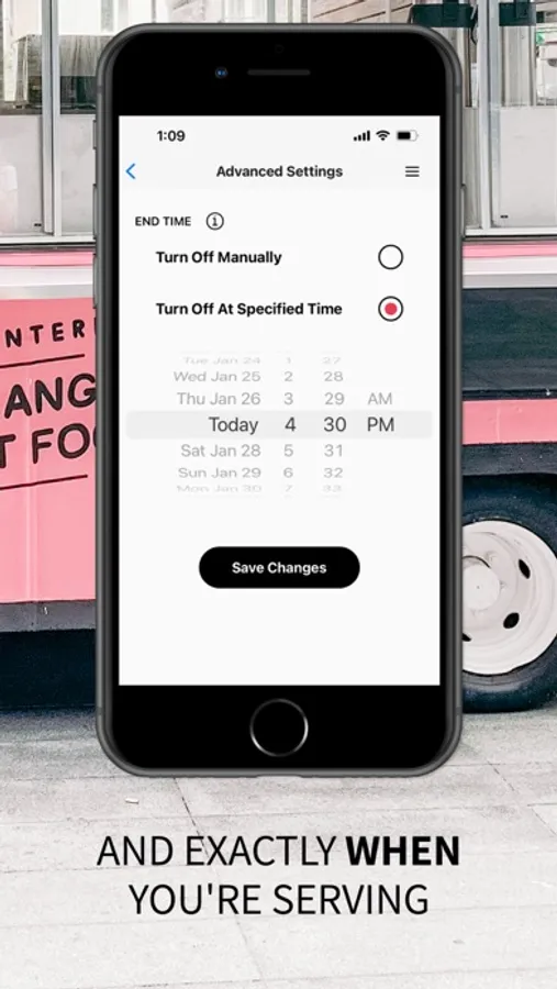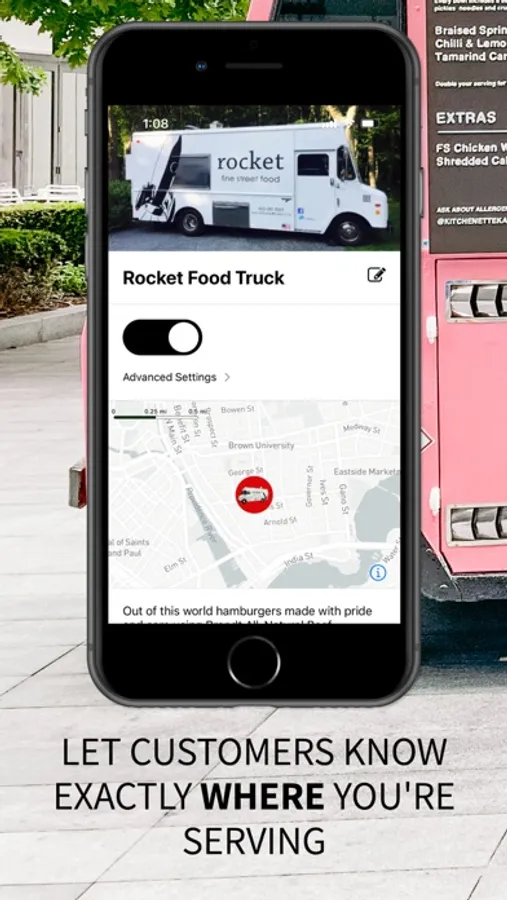 • Tap a single button to broadcast your truck's location (real-time status). This tells customers that your truck is open for business, and exactly where to find you. Customers who follow you will also receive a push notification. You can also configure an automatic closing time. When this time is reached, your truck is automatically taken off the map, and customers will know you’re closed for the day.