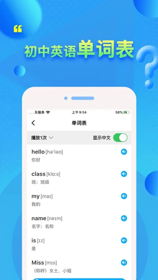 同步课本各单元单词听力,音频。可设置复读次数,自动播放功能。用户可设置显示或隐藏中文。