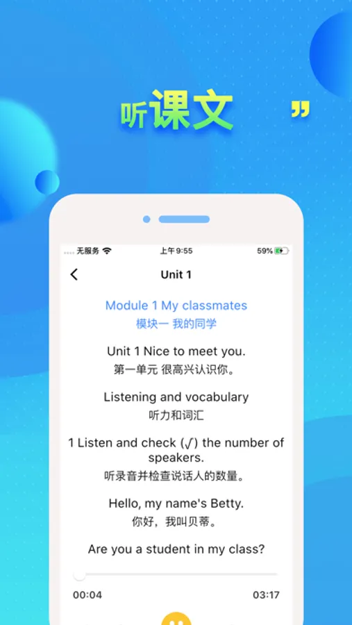 同步课本各单元听力,音频。与单纯音频播放不同,增加语速调整,中英文对照,播放进度控制声音播放与文本同步。