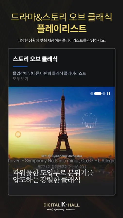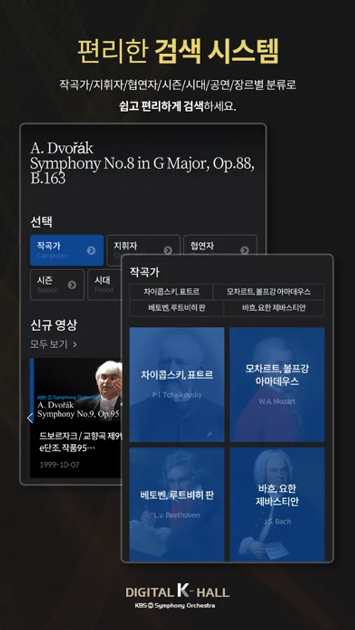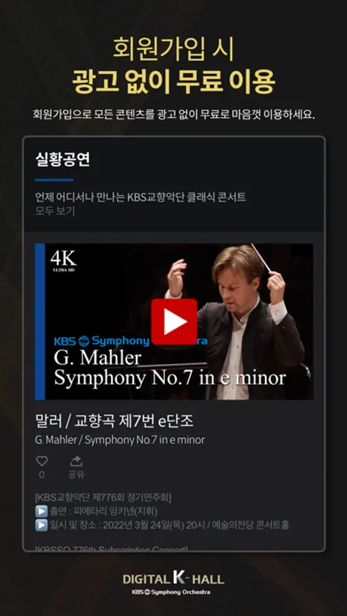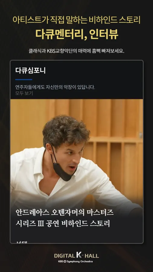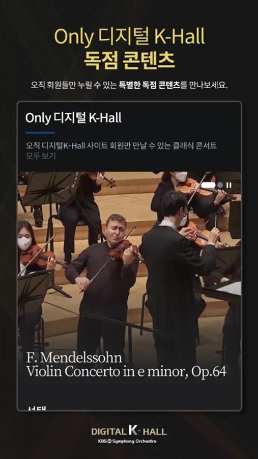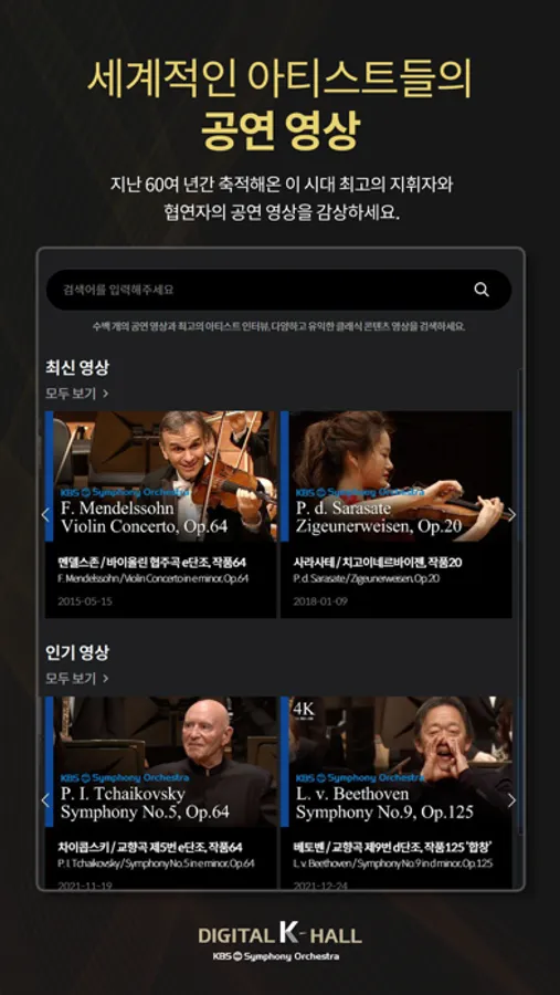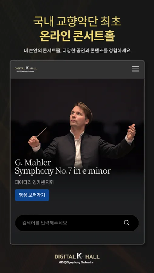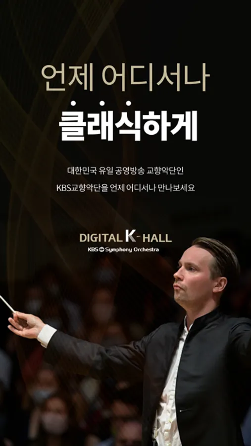 디지털 K-Hall은 대한민국 유일 공영방송 교향악단인 KBS교향악단이 선보이는 국내 최초의 온라인 콘서트홀입니다. 디지털 K-Hall을 통해 최고의 클래식 음악 콘텐츠, 세계적인 지휘자와 연주자의 공연을 언제 어디서나 무료로 감상하세요.