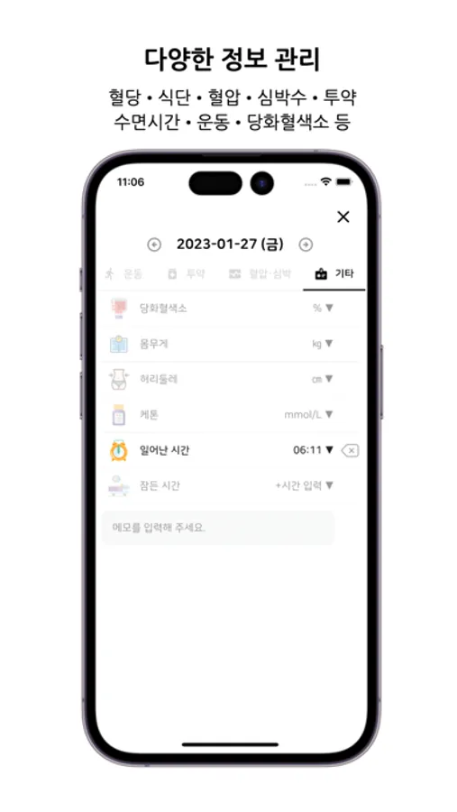 - 투약정보, 혈압, 심박수, 몸무게, 당화혈색소, 메모 기록, 기상, 취침시간