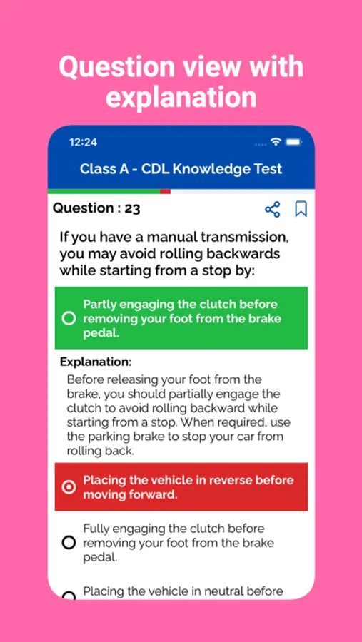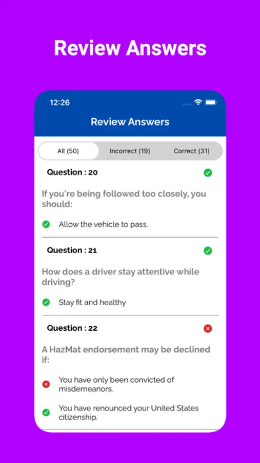 Our app includes a variety of practice questions for the Driver's license exam for Commercial Vehicles. These questions are based on the official handbook of different states.
