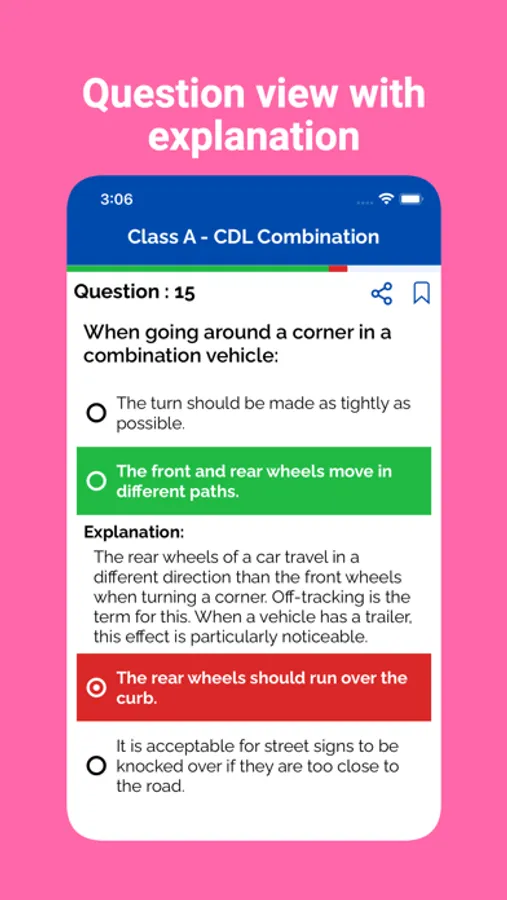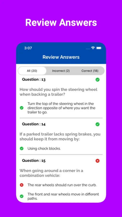 Our app includes a variety of practice questions for the Driver's license exam for Commercial Vehicles. These questions are based on the official handbook of different states.