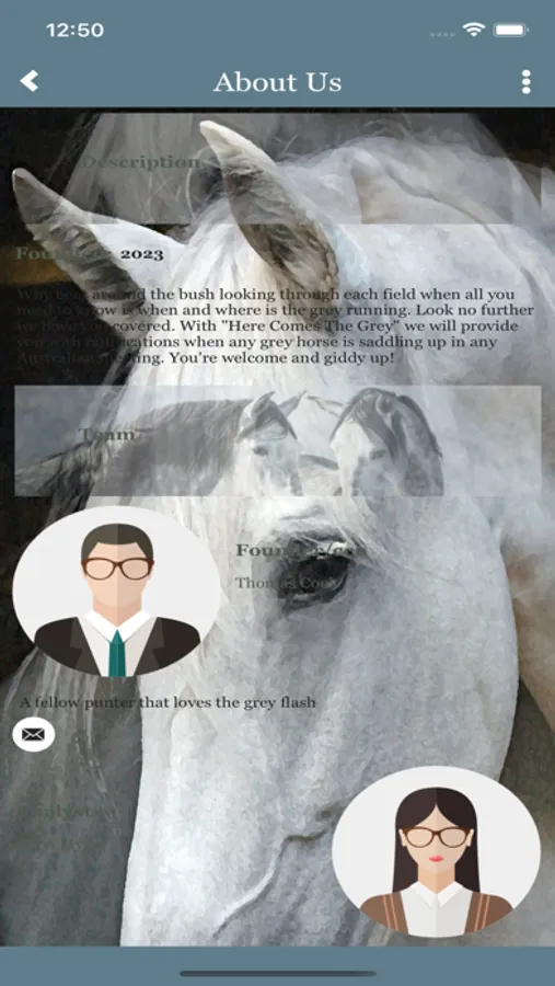 We provide you with information on every grey horse getting a start in any Australian TAB meeting. An easy to use app for any punter to use so giddy up and see you at the races.