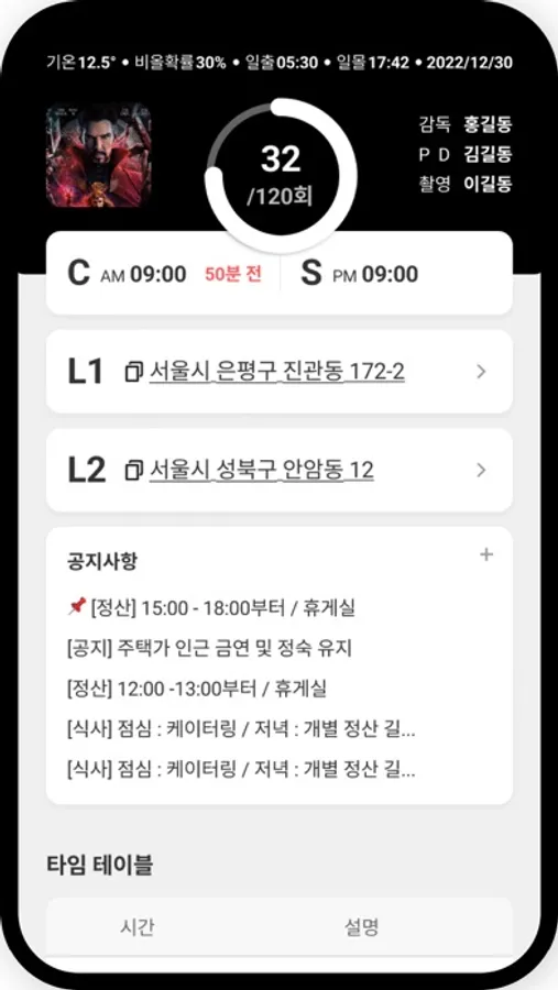 현재 시간에 맞추어진 촬영정보제고, 스탭 및 배우 출여진 관리,
