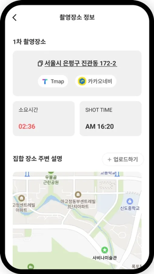 촬영지까지 소요시간 및 촬영 시간 정보를 한눈에 제공합니다.
