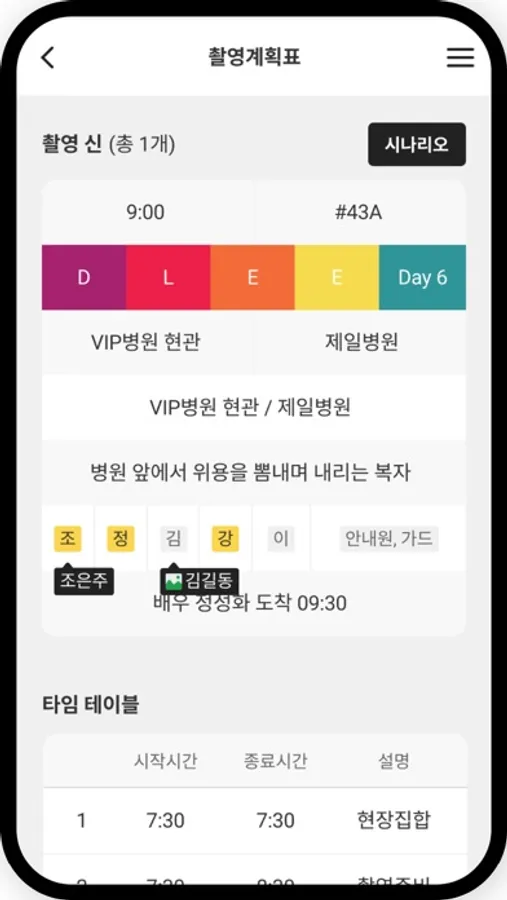 문서화 된 일일촬영 계획표를 촬영 장소 및 시간에 나누어,