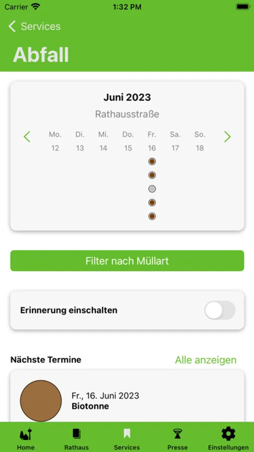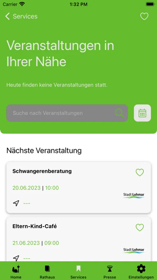 Das Modul „Services“ stellt eine große Auswahl der in Lohmar verfügbaren Angebote zur Verfügung. Unteranderem gibt ein Modul zur „Abfallwirtschaft“ die Abfuhrtermine der RSAG für einen bestimmten Wohnort (Straße) wieder und auf Wunsch kann mit Push-Nachrichten an das Rausstellen der Mülltonnen erinnert werden. Freizeit-Tipps hält das Modul zu Veranstaltungen bereit. Es informiert über aktuelle Veranstaltungen in Lohmar und ermöglicht eine Navigation zum Zielort. Car-Sharing, VHS und CoWorking stehen hier ebenfalls als Verlinkung bereit.
