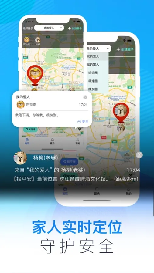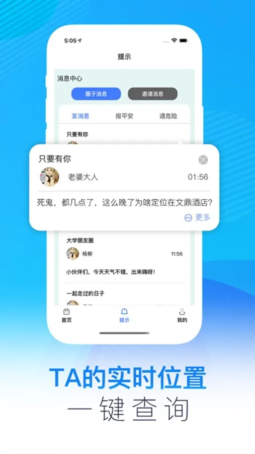 一款功能强大的手机定位软件,它可以实时共享手机定位,实时记录亲友足迹,查看历史轨迹记录。关爱家人,守护爱人,一键即可查看TA的位置,手机号码定位准确,位置更新及时,还可创建共享圈子生成圈子邀请码,分享给您的好友一起加入位置共享圈子。可以帮助您实时关注朋友、家人的日常位置轨迹,关心他们的安全。软件提供了各种便捷功能,遇到危险点击”遇危险“一键提醒家人。安全到达目的地点击”报平安“一键通知好友位置信息。无聊的时候点击发消息,也可以和圈内好友唠唠嗑。