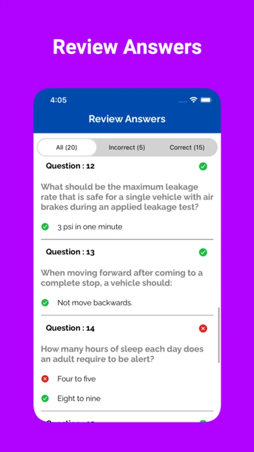 Our app includes a variety of practice questions for the Driver's license exam for Commercial Vehicles. These questions are based on the official handbook of different states.