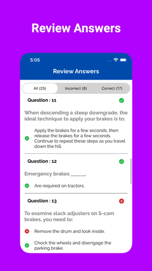 In addition, the app provides a list of weak questions based on practice tests on CDL Prep Test.
