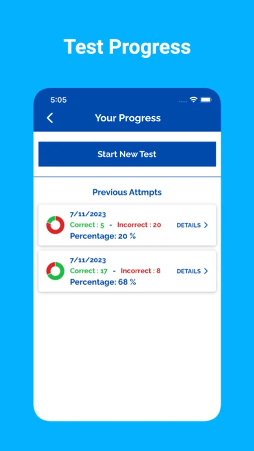 App tracks the users completed practice tests. The app tracks their progress, allowing them to identify areas for improvement and track their overall progress.