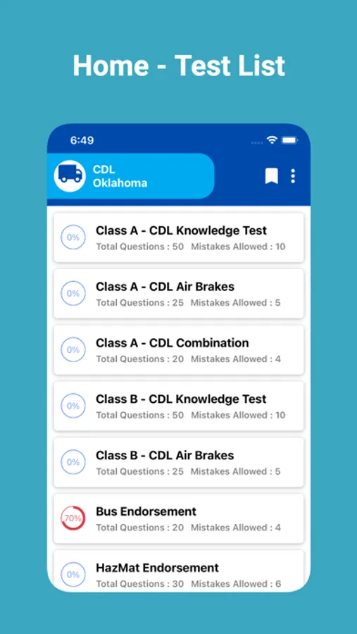 The app includes a variety of practice questions for the CDL exam. These questions are based on the Oklahoma CDL handbook Users can track their progress and identify areas where they need more practice, allowing them to focus their studying on the areas where they need the most improvement.
