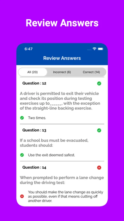 Our app includes a variety of practice questions for the Driver's license exam for Commercial Vehicles. These questions are based on the official handbook of different states.