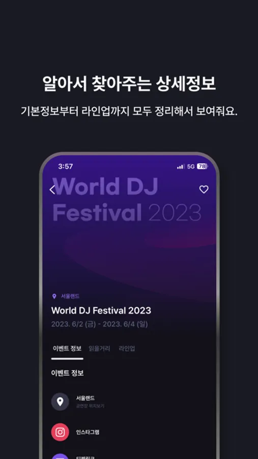 - 더이상 타임테이블 이미지는 그만, 페스티벌 / 파티 정보와 실시간 타임테이블을 쉽게 확인할 수 있어요.