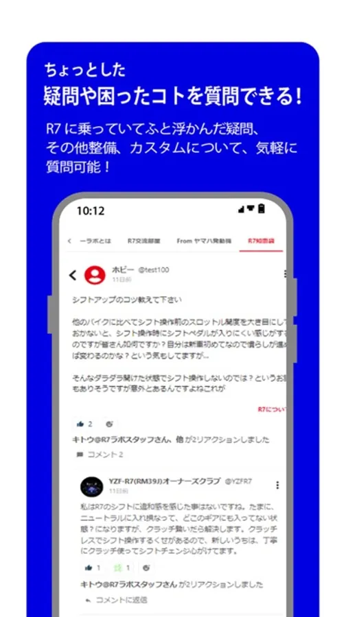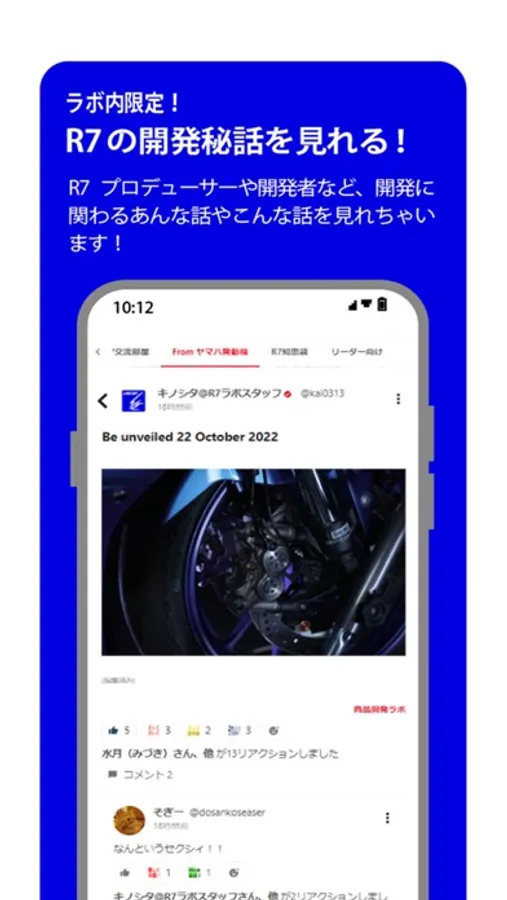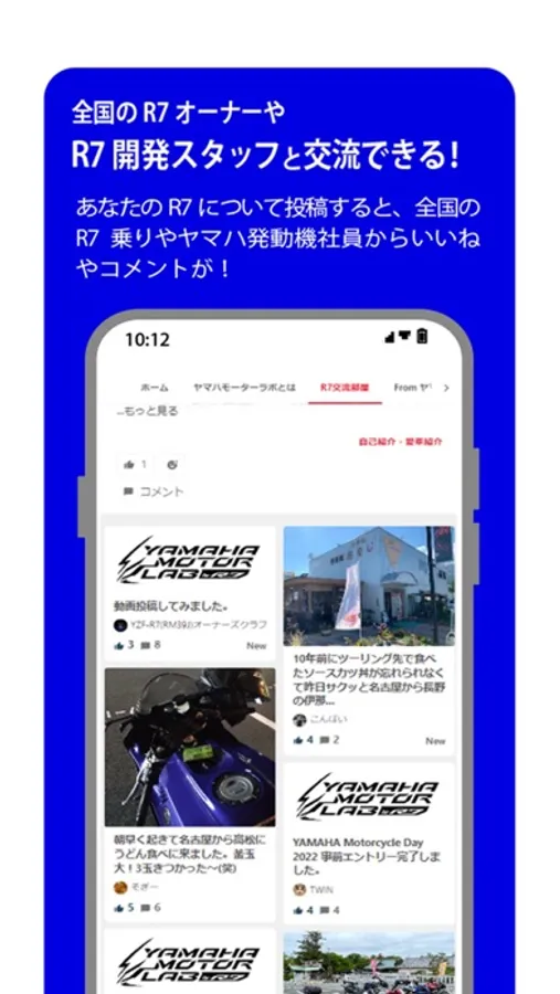 ヤマハモーターラボ for R7は、お客様とヤマハ発動機スタッフが直接交流できるコミュニティアプリです。