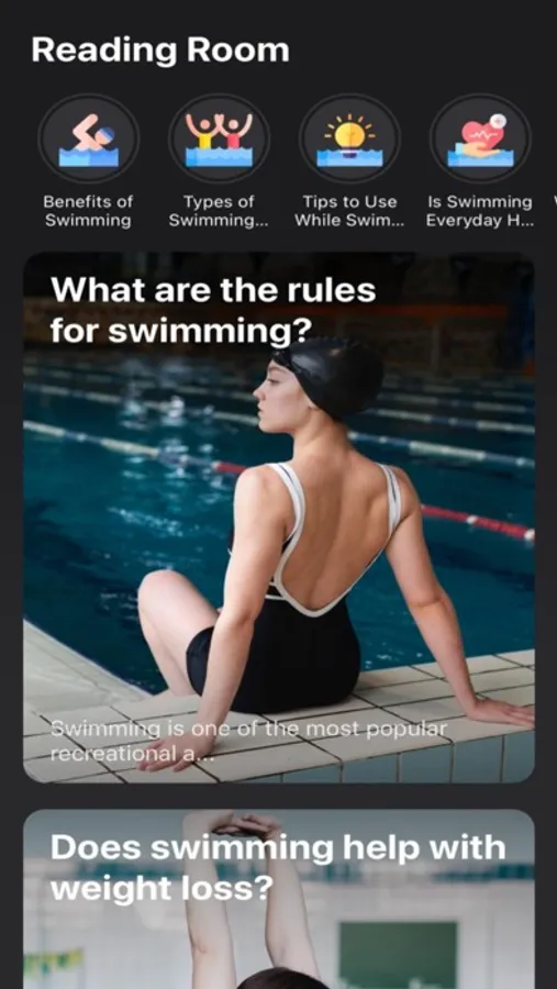 Our app will improve your swimming skills and increase your fitness levels. We also have swimming exercises for you to maintain a good healthy body. You can also find helpful articles regarding swimming tips, things to take care of while swimming, and dos and don'ts of swimming. Swimming is a kind of aerobic activity that strengthens your arms and legs and provides fitness. Swimming exercises are really good for your health.
