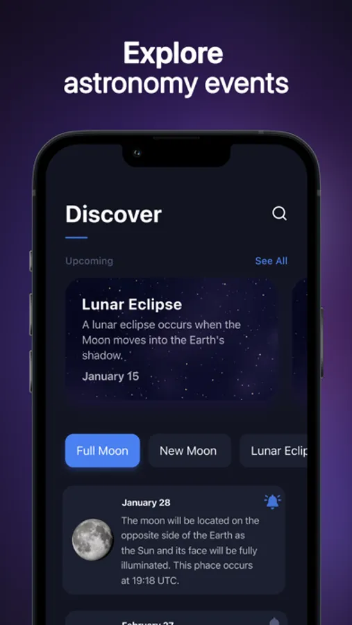 Whether you just quickly want to explore any upcoming events or want to know when the next solar eclipse is happening, you're in the right place. Simply check out our Discover page and find yourself something you like.