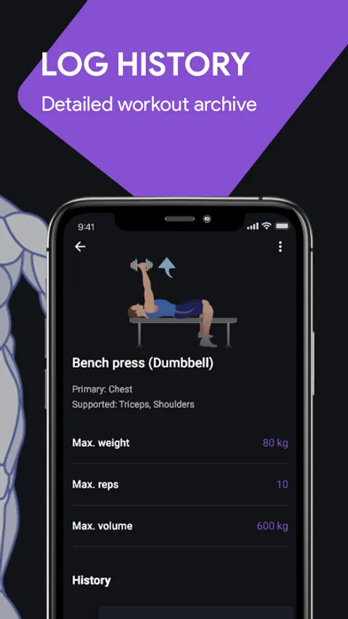 History Log - Record and log your daily workouts, including type of exercise, duration, and intensity. Log the details including the exercises performed, sets, reps, and weight used.