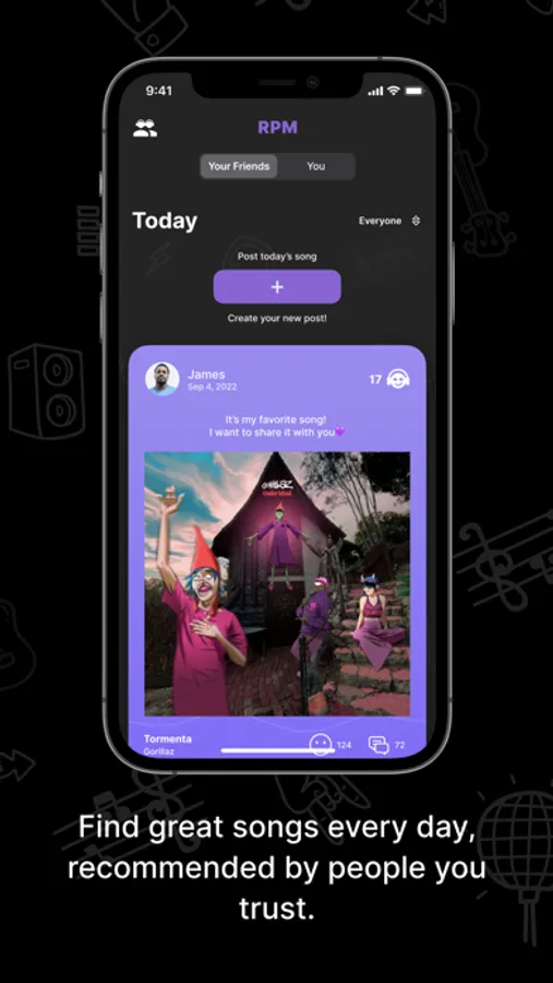 RPM is the first social media platform dedicated to sharing music you love with the people you love. Post one song per day to let your friends know what you’re listening to, and find new music in seconds by checking your friends’ daily selections. Skip the algorithms and join the app made for personal song recs between friends.