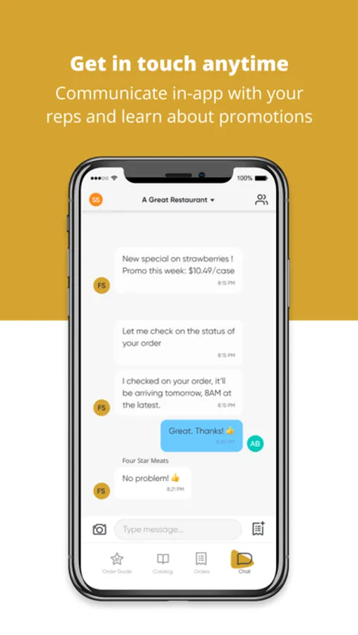 - Get in touch anytime: communicate directly with your Four Star Meats rep in the app