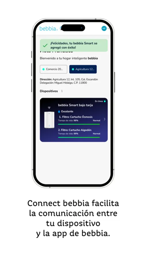 Connect bebbia te ayudará a que fácilmente desde tu app bebbia monitorees cuál es la calidad de agua que bebes, el estado de los cartuchos de tu purificador así como tu consumo de agua.