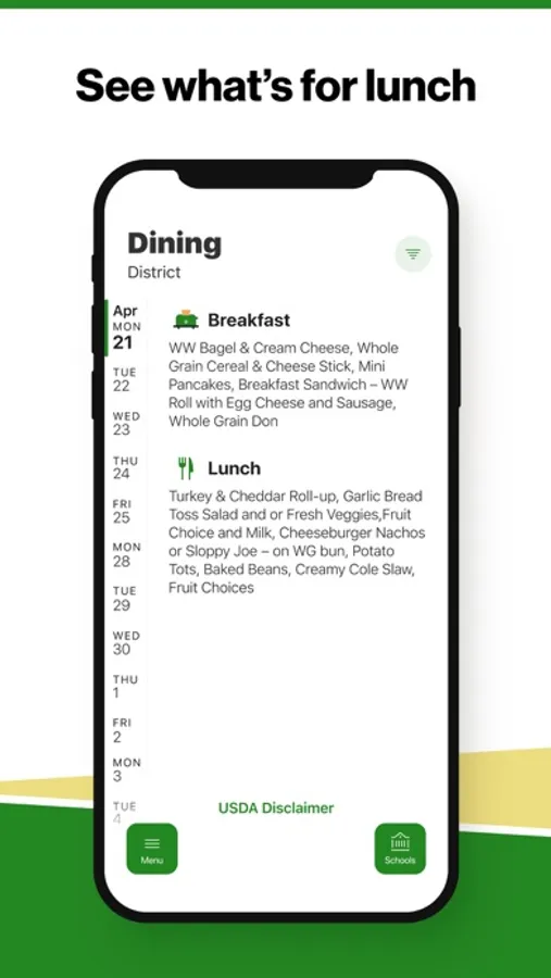 Within the dining section, you'll find an easy to navigate, weekly menu, sorted by day and meal type.