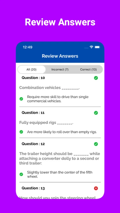 Our app includes a variety of practice questions for the Driver's license exam for Commercial Vehicles. These questions are based on the official handbook of different states.