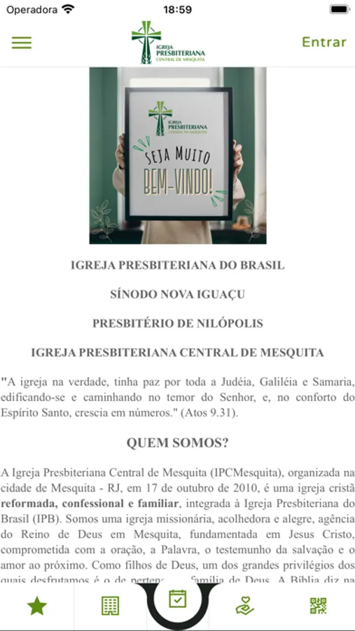 Olá, tudo bem? Que privilégio ter você aqui! Inscreva-se em nossos eventos e conheça os horários de culto e outras programações. Em nosso APP você encontrará palavras de encorajamento e ânimo, assistirá nossas transmissões ao vivo, conhecerá nossa agenda e até poderá fazer um pedido de oração e agendar um aconselhamento ou uma visita com nosso pastor.