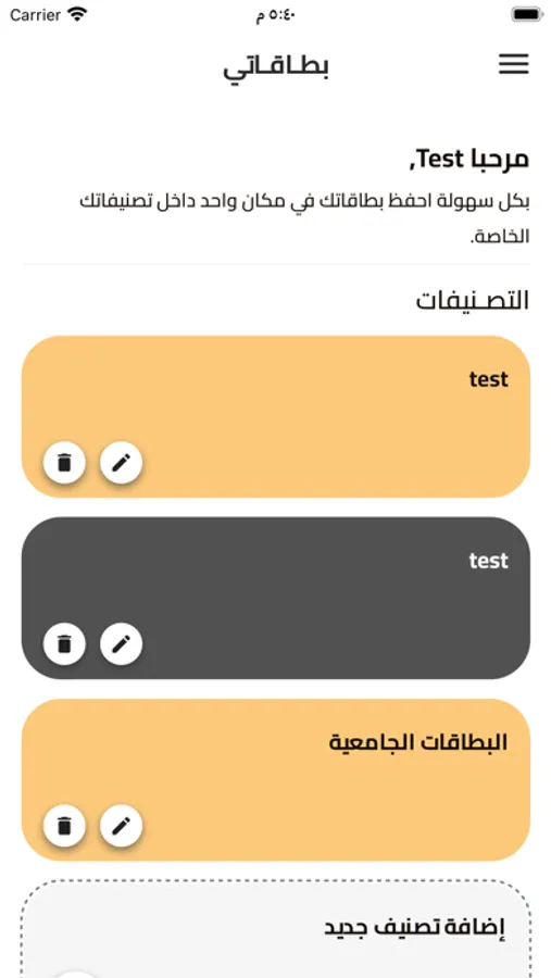 يتيح لك تطبيق بطاقاتي بتنظيم وإدارة بطاقاتك ، أنشئ حسابًا وابدأ بإنشاء الفئات الخاصة بك ، ضمن كل فئة يمكنك إضافة وتحرير وحذف البطاقات وكل بطاقة لها اسم وصورة من اختيارك ، يتم تصوير البطاقات داخل التطبيق وأيضا لديك القدرة على تعديل صور البطاقات واقتصاصها قبل اضافتها ، .سواء كنت تبحث عن حفظ بطاقاتك المهمة أو ترغب فقط في الحفاظ على تنظيم معلوماتك ، فإن تطبيق بطاقاتي هو الحل الأمثل.