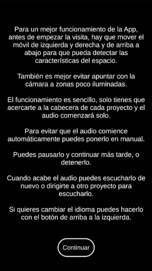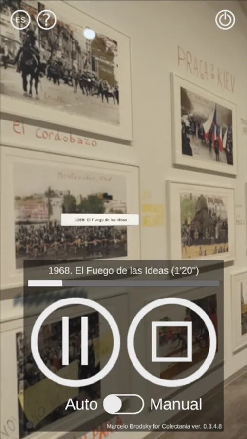 El Audio Guía para la exposición de Marcelo Brodsky en FotoColectania permite escuchar los textos y el audio de ambiente de la exposición de forma automática, tan solo es necesario acercarse a cada uno de los proyectos expuestos para oírlos. Los audios se pueden pausar o detener por medio de unos botones bien grandes, y también es posible desactivar el modo automático y activar el audio de los proyectos manualmente.