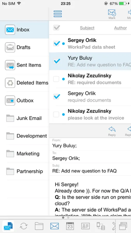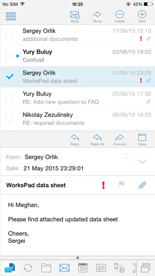 •Встроенный клиент корпоративной электронной почты Microsoft Exchange, к которому подключен сервер WorksPad