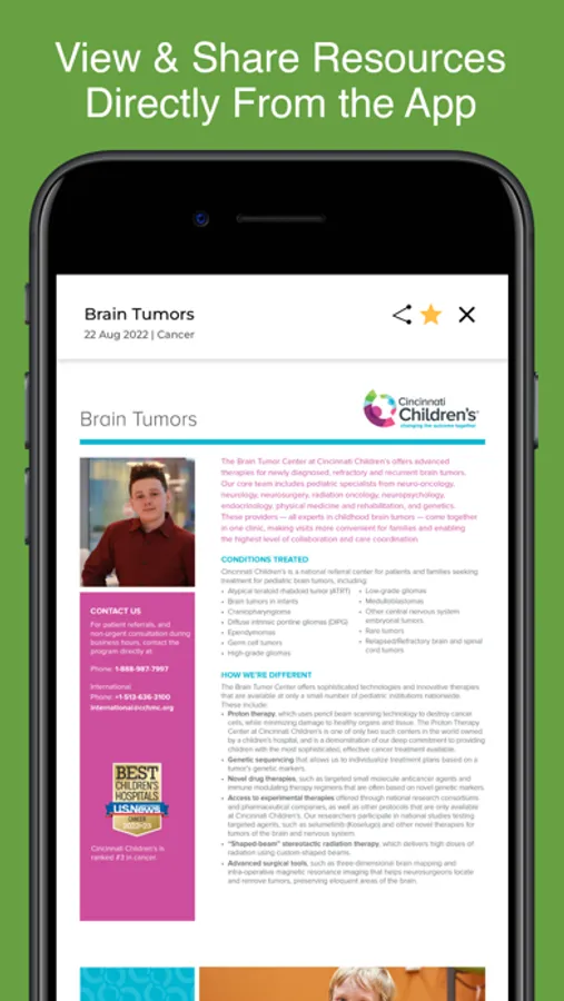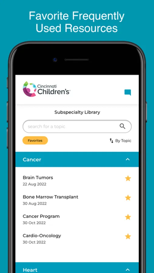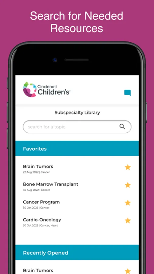 Pediatric subspecialist references. Each link opens information on Cincinnati Children's divisions and programs. The app is designed to be clean and efficient for use by pediatric specialists.