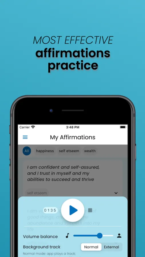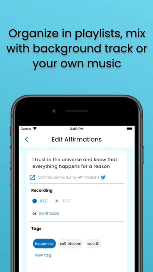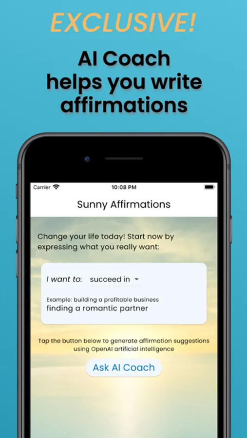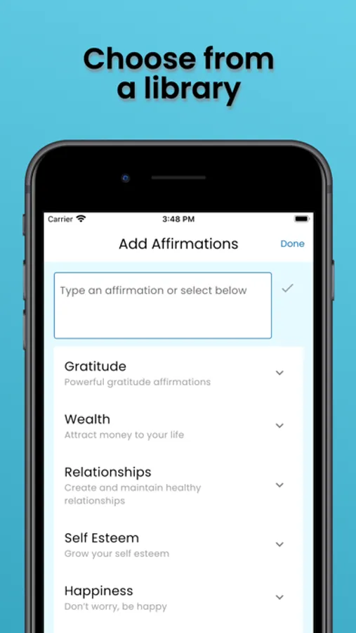 - Select affirmations from a catalog, type in your own, or get AI suggestions