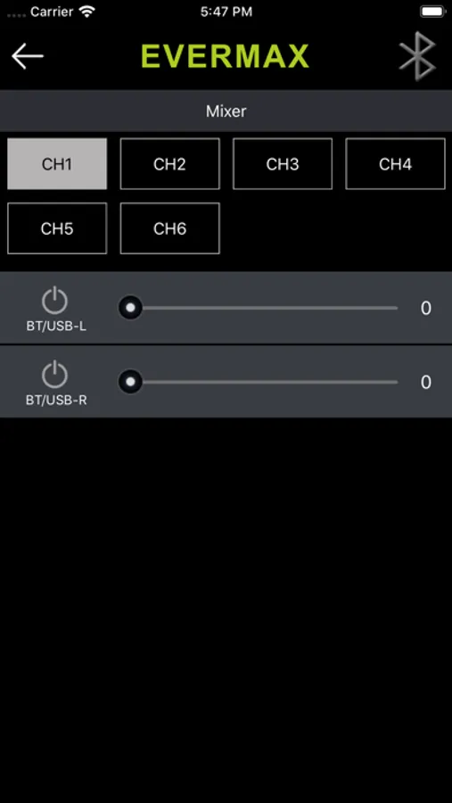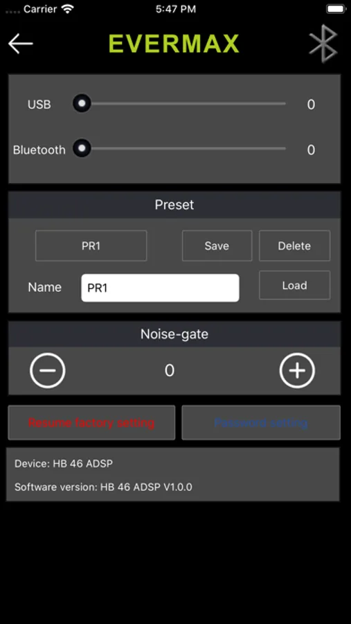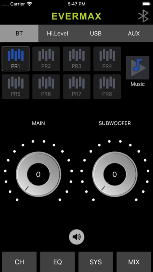In the main screen you will find the Input Source menu where you can choose BT, HI-LEV, USB and AUX. Here you also find 8 Presets (saved into your device) to choose from, you access the Music Player, you have the Main and Subwoofer Volume, and the Advanced menu with Channels, EQ, System and Mixing.