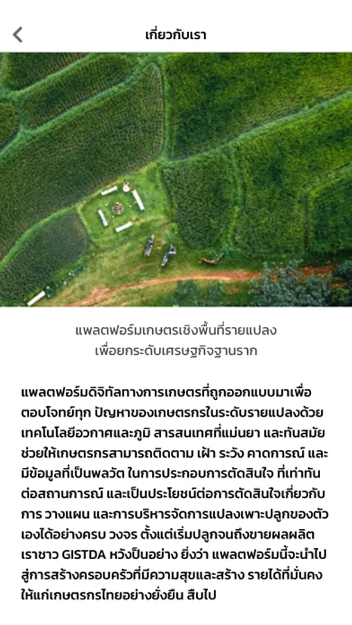 แพลตฟอร์มดิจิทัลทางการเกษตรที่ถูกออกแบบมาเพื่อตอบโจทย์ทุก ปัญหาของเกษตรกรในระดับรายแปลงด้วยเทคโนโลยีอวกาศและภูมิสารสนเทศที่แม่นยาและทันสมัย ช่วยให้เกษตรกรสามารถติดตาม เฝ้า ระวัง คาดการณ์ และมีข้อมูลที่เป็นพลวัต ในการประกอบการตัดสินใจ ที่เท่าทันต่อสถานการณ์ และเป็นประโยชน์ต่อการตัดสินใจเกี่ยวกับการ วางแผน และการบริหารจัดการแปลงเพาะปลูกของตัวเองได้อย่างครบ วงจร ตั้งแต่เริ่มปลูกจนถึงขายผลผลิต เราชาว GISTDA หวังป็นอย่างยิ่งว่า แพลตฟอร์มนี้จะนำไปสู่การสร้างครอบครัวที่มีความสุขและสร้างรายได้ที่มั่นคงให้แก่เกษตรกรไทยอย่างยั่งยืน สืบไป